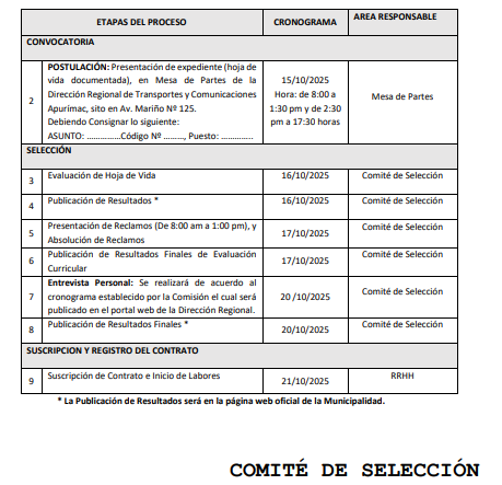 De conformidad al tercer párrafo del acápite V de las Bases “Cualquier controversia, situación no prevista interpretación a las bases que se susciten o se requieran durante el proceso de selección, será resuelto por el Comité de Selección”, por lo que, los miembros del Comité de Selección por unanimidad ante el feriado calendario y el feriado provincial decretado por la Municipalidad Provincial de Abancay por las fiestas de la Virgen del Rosario Patrona de la ciudad de Abancay, APRUEBA POR UNANIMIDAD REPROGRAMAR LOS PLAZOS DEL CRONOGRAMA DE LA CONVOCATORIA, en sus etapas pendientes de realizarse y que se detalla a continuación:
