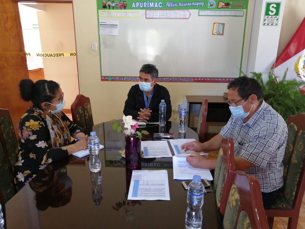 El Director Regional de Transportes y Comunicaciones de Apurímac acompañado del Director de Telecomunicaciones sostiene reunión de trabajo con la Mag. Lourdes del Carmen Vigil Mamani Directora Regional de Educación sobre la instalación de nuevas estaciones de radio y televisión nacional del Perú y la instalación de paneles solares para las localidades más alejadas y de escasos recursos económicos, para de esa manera permitir el acceso al programa virtual APRENDO EN CASA.