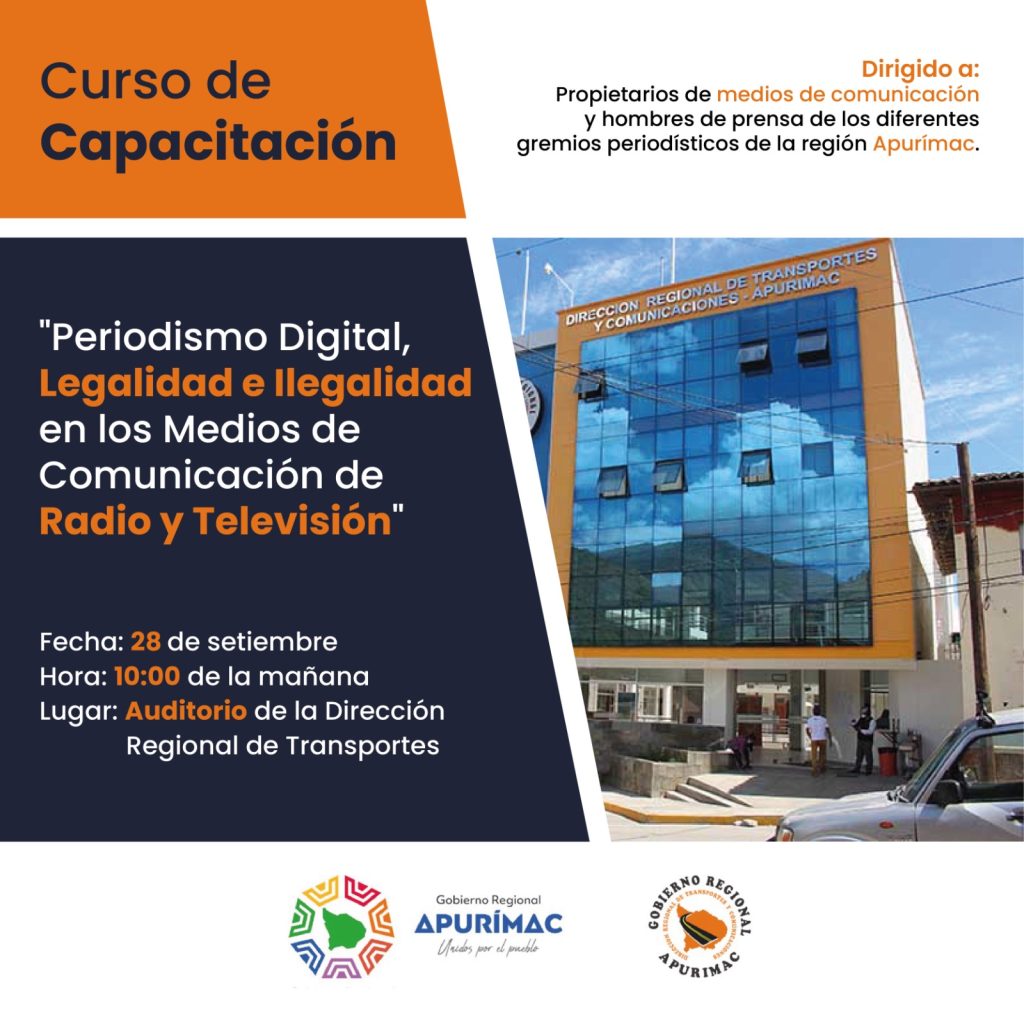 Curso de capacitación, «Periodismo Digital, Legalidad e Ilegalidad de Medios de Comunicación de Radio y Televisión» Dirigido a: propietarios de medios de comunicación, hombres y mujeres de prensa de la región Apurímac. EXPOSITOR: LIC. RAMIRO CANAL BEISAGA, LICENCIADO EN CIENCIAS DE LA COMUNICACIÓN – UNSAAC.