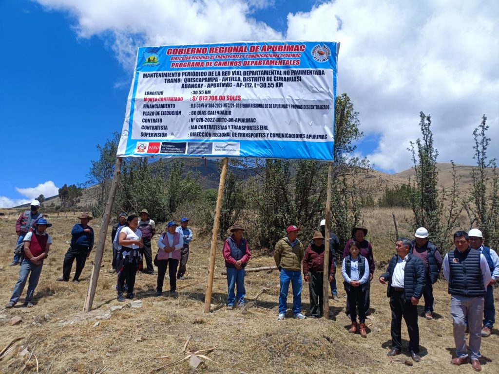 El Director Regional de Transportes y Comunicaciones en representación del Gobernador Regional de Apurímac acompañado de su equipo técnico autoridades y pobladores de las localidades de Curahuasi, Quiscapampa, CCocha, Antilla y Trigo Orcco dieron inicio a los trabajos de mantenimiento periódico en dos tramos, el primero corresponde a la red vial departamental no pavimentada tramo AP-112EMP Curahuasi – Antilla el cual tiene una longitud total de 24.24 kilómetros donde se realizaran trabajos de reposición y afirmado de vía, así mismo también se dio inicio a los trabajos en el segundo tramo de mantenimiento periódico de la red vial departamental no pavimentada Quiscapampa – Antilla el cual tiene una longitud de 30.55 kilómetros mediante estos trabajos se tiene previsto el mejoramiento de dicha vía de comunicación para garantizar un transito seguro y dinamizar la economía de cientos de pobladores.