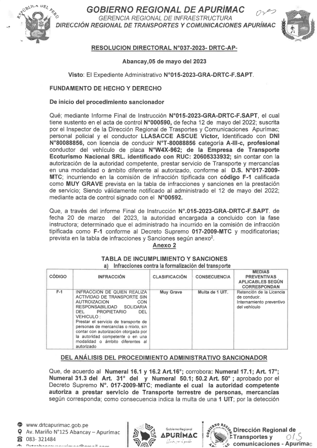 RESOLUCIÓN DIRECTORAL N°037-2023-DRTC-AP