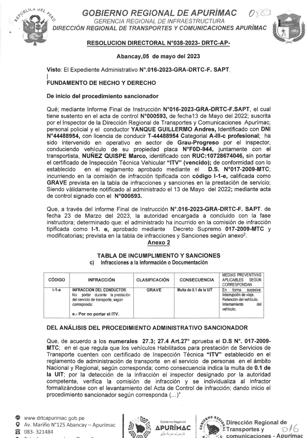 RESOLUCIÓN DIRECTORAL N°038-2023-DRTC-AP