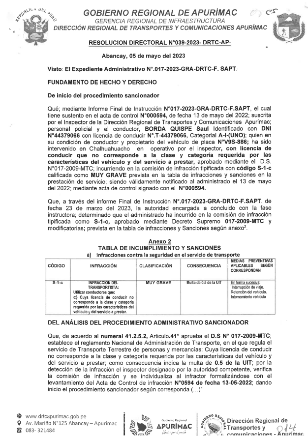 RESOLUCIÓN DIRECTORAL N°038-2023-DRTC-AP