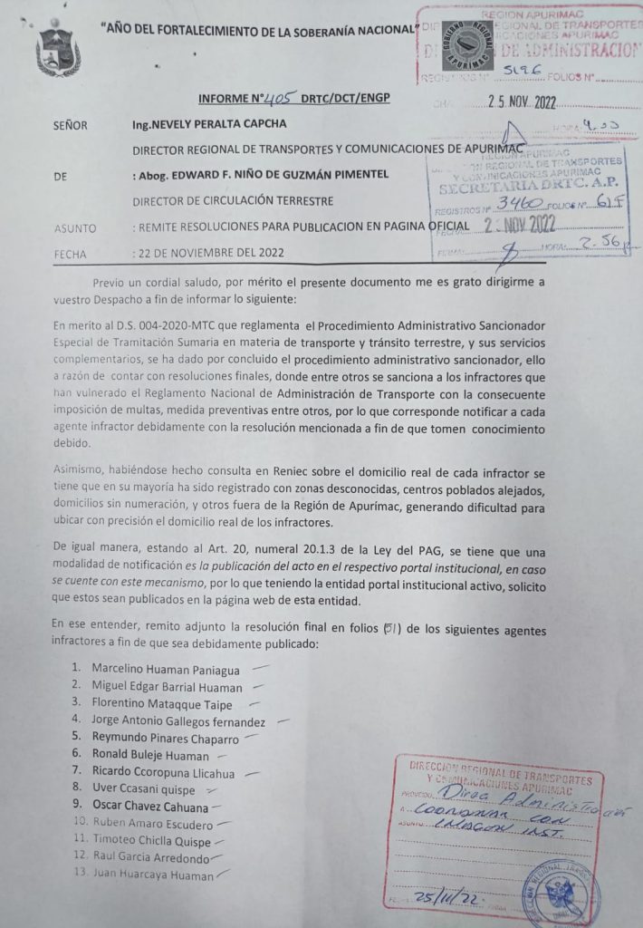 COMUNICADO: SE PONE EN CONOCIMIENTO DE LOS SIGUIENTES USUARIOS QUE SE EMITIERON LAS RESOLUCIONES DE SANCIONES POR INFRACCIONES AL REGLAMENTO NACIONAL DE ADMINISTRACIÓN DE TRANSPORTE.