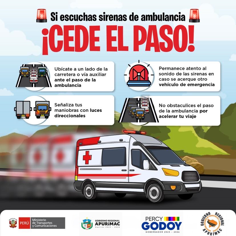 Recuerda amigo transportista, la atención oportuna de heridos por accidentes viales u otros factores, es fundamental para salvar una vida. Si escuchas la sirena de una ambulancia o vehículo de emergencia, cede el paso. ¡No seas indiferente y ayuda a que su circulación sea más rápida!